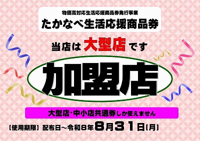 たかなべ生活応援商品券は、国の「物価高騰対応重点支援地方創生臨時交付金」および「宮崎県物価高対応プレミアム付商品券等発行事業(国の重点支援地方交付金を活用)」を活用して、物価高騰の影響を受ける町民の皆さまの生活支援と町内消費の喚起を行うため、町内の「たかなべ生活応援商品券」取扱店舗で使用できる商品券です。