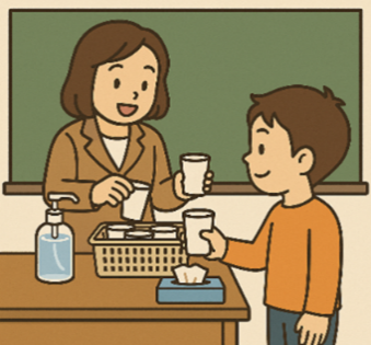 1.10mlの洗口液が入った紙コップ・ティッシュを配付します。